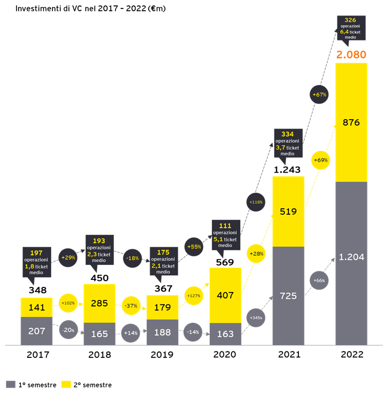 In Italia, nel 2022, gli investimenti in Venture Capital hanno raggiunto e superato il traguardo dei due miliardi. Con una raccolta di € 2,08 miliardi, startup e scaleup italiane fanno segnare un +67,3% rispetto ai € 1,24 milioni del 2021, in controtendenza anche rispetto a ecosistemi più maturi come UK e Germania